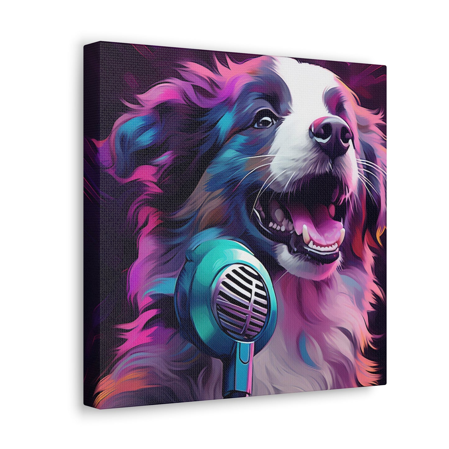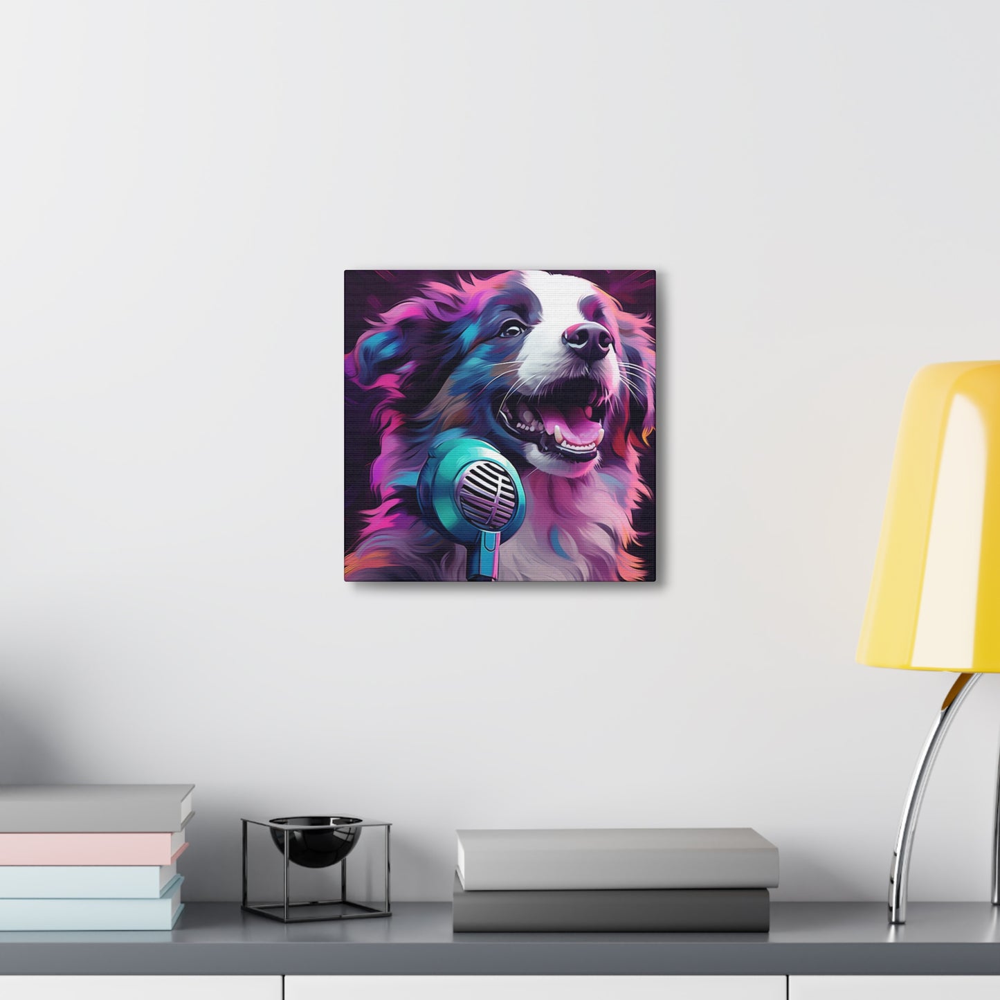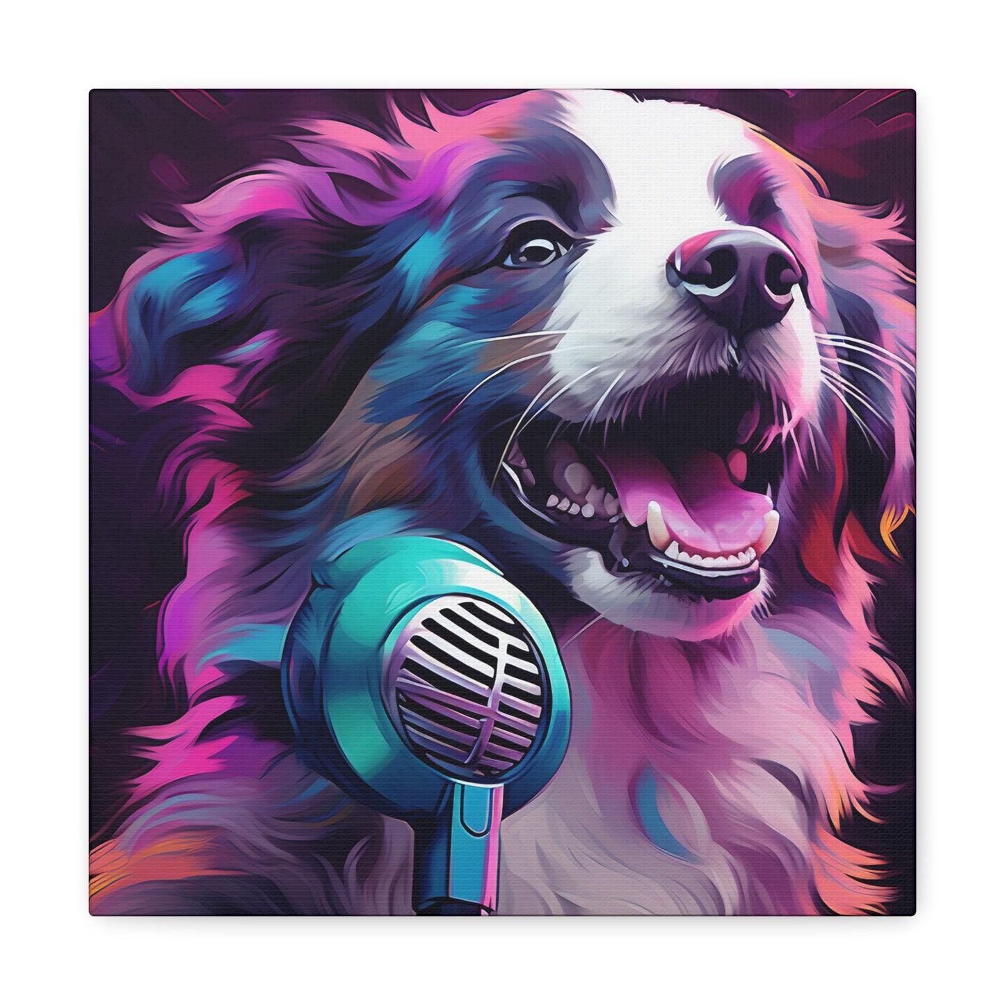 This poppin' piece features an adorable Aussie Shepherd belting out synthwave tunes, mic on paw!🎤 Light up your room with its vibrant neon vibes. Easily moves to the rhythm of 80s synthpop nostalgia without scratching your furniture. Truly, the perfect wall pal for any music fan or dog lover. #VaporwaveVibes #PupPopStar #AussieArt #NeonNights #SynthSoPupular #CanineCanvas #BarkingBeats #WallArtWoofs #RetroRufus #GeekeryGifts. And remember, unlike real pets, you'll never have to stop this wall art from barking at the postman! 🦮