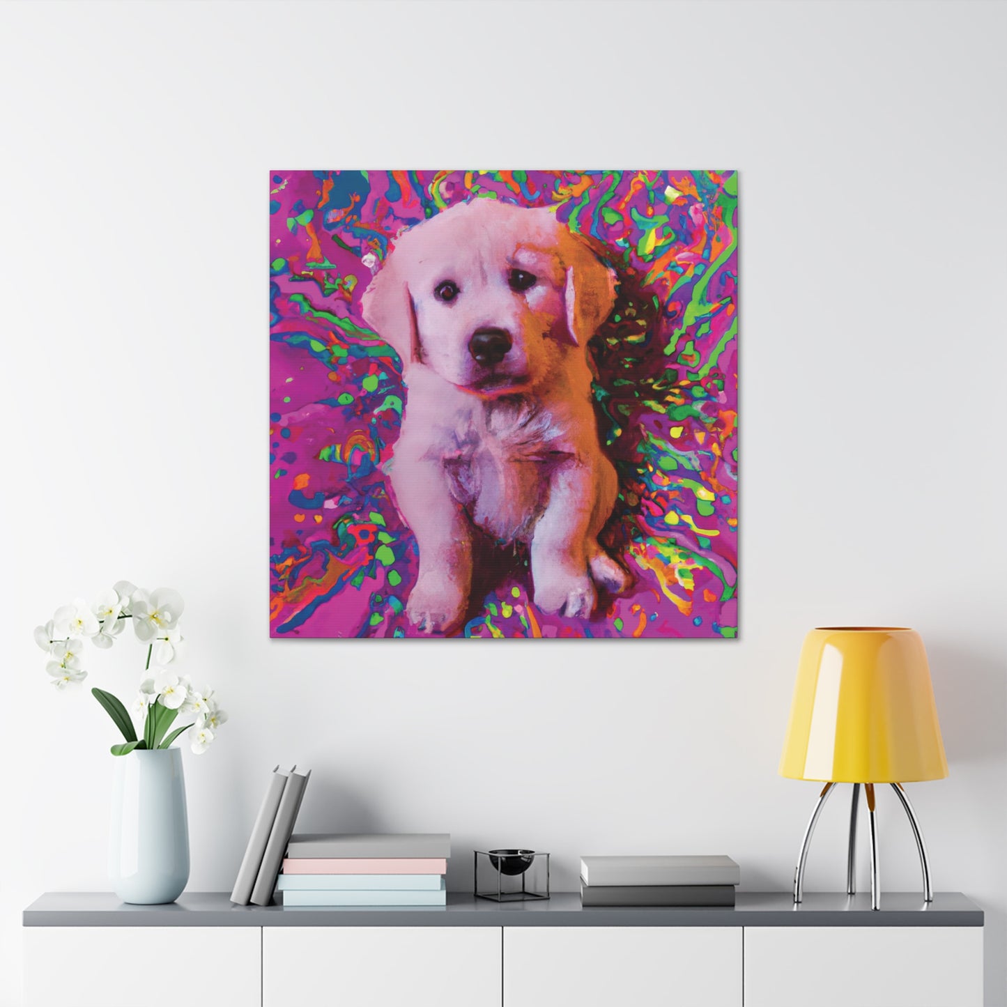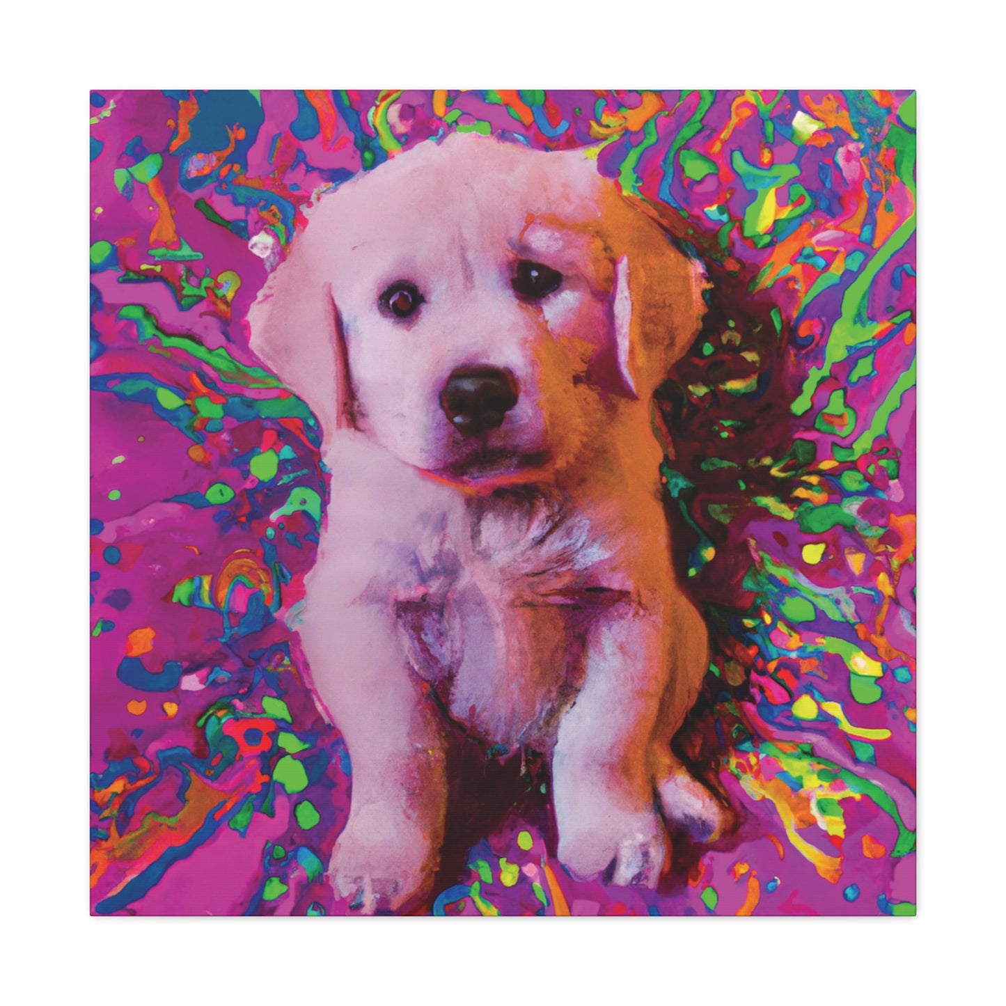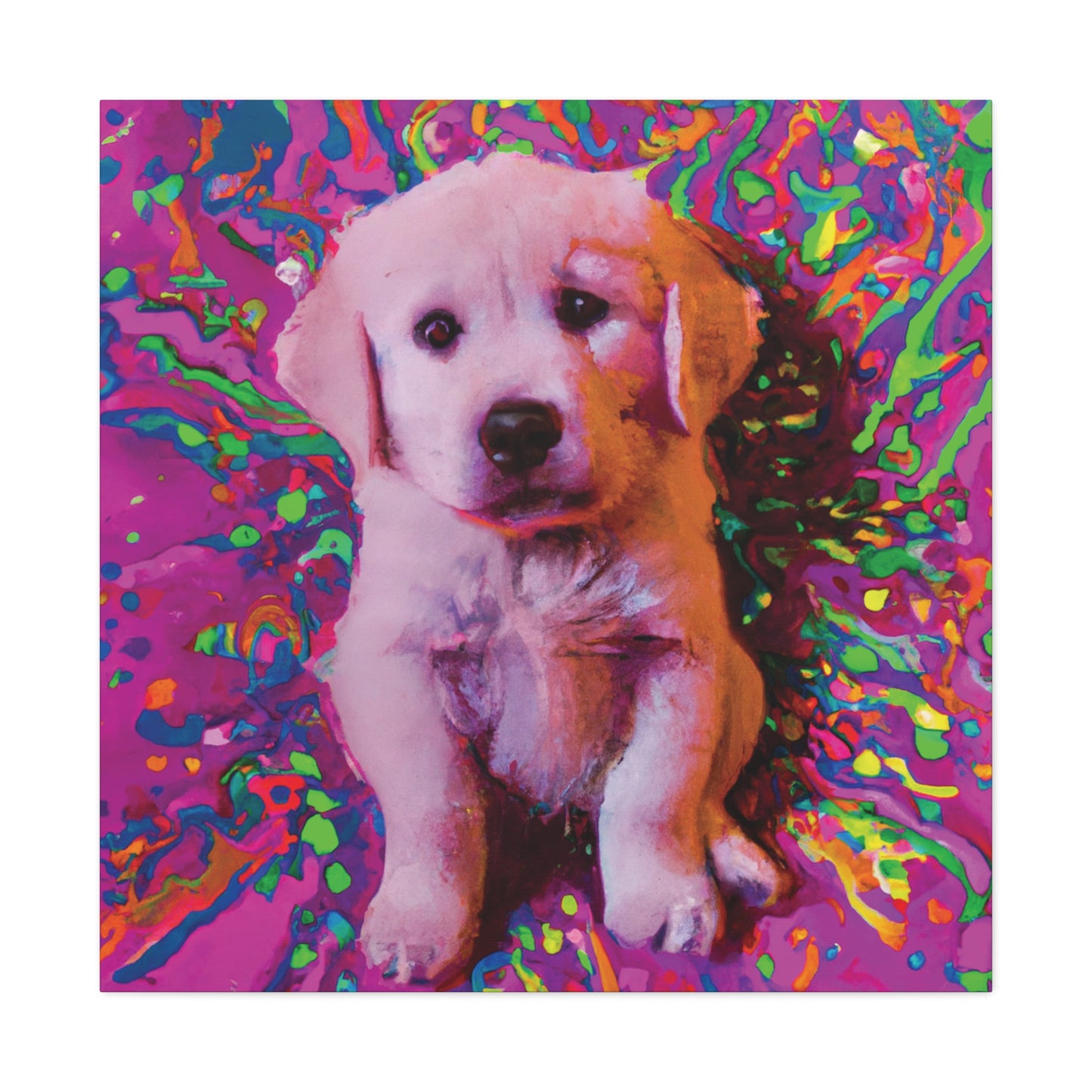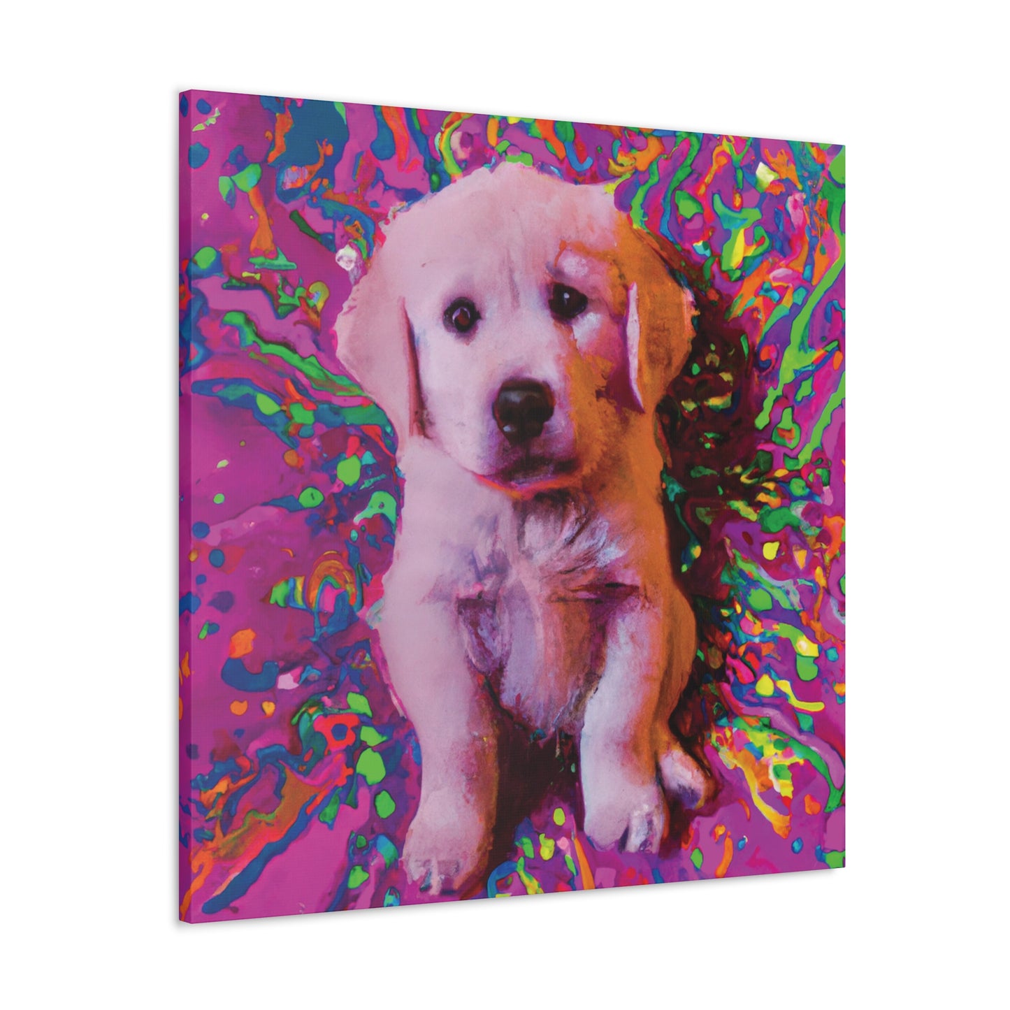 This vibrant canvas will liven up any space with the incredibly whimsical and colorful portrait of a golden retriever puppy. From their soulful eyes to the unique color palette, this painting will bring a dreamy look to your wall and transport you to another realm. Our playful pup will remind you to find joy and live out of the box of everyday obligations. Get ready to make a statement in your space with this mystical and transcendent painting!⭐️ 😊 Plus, you never have to worry about it barking at the UPS truck! #goldenretriever #retrieverpuppy #puppy #dogsofinstagram #artlovers #artforsale #homedecor #canvasart #puppyart #dogart #shopsmall #dogpaintings #wonderfulwalls #creativepainting