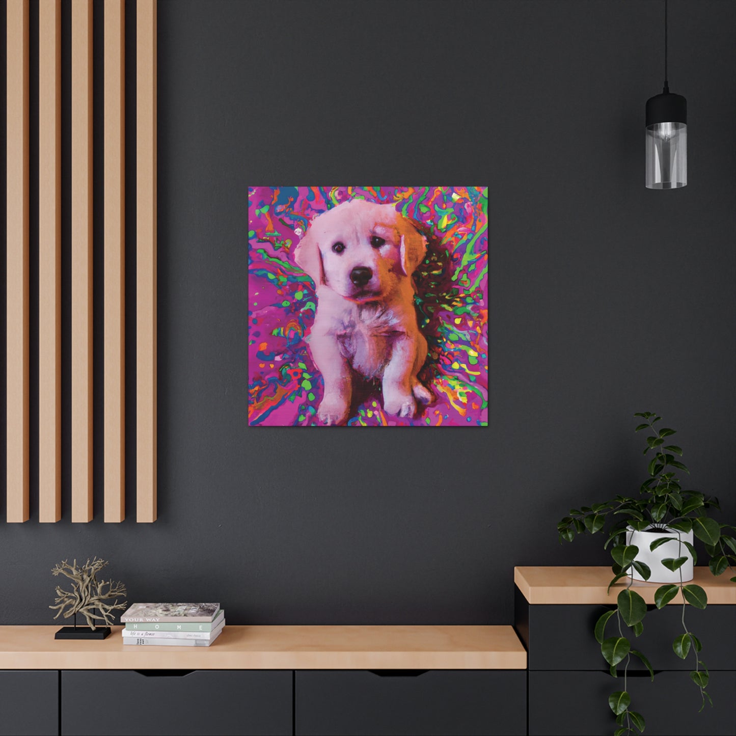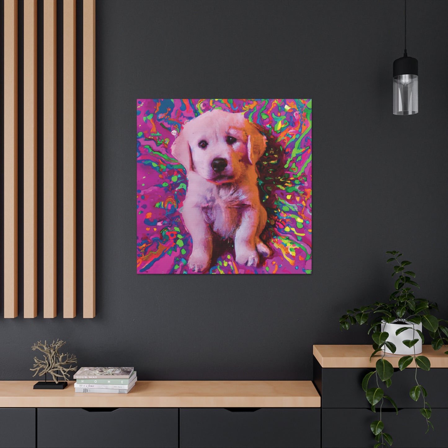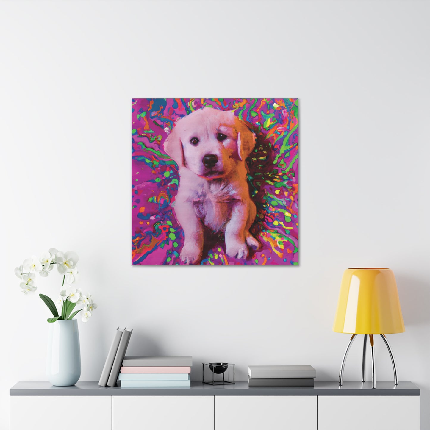 This vibrant canvas will liven up any space with the incredibly whimsical and colorful portrait of a golden retriever puppy. From their soulful eyes to the unique color palette, this painting will bring a dreamy look to your wall and transport you to another realm. Our playful pup will remind you to find joy and live out of the box of everyday obligations. Get ready to make a statement in your space with this mystical and transcendent painting!⭐️ 😊 Plus, you never have to worry about it barking at the UPS truck! #goldenretriever #retrieverpuppy #puppy #dogsofinstagram #artlovers #artforsale #homedecor #canvasart #puppyart #dogart #shopsmall #dogpaintings #wonderfulwalls #creativepainting