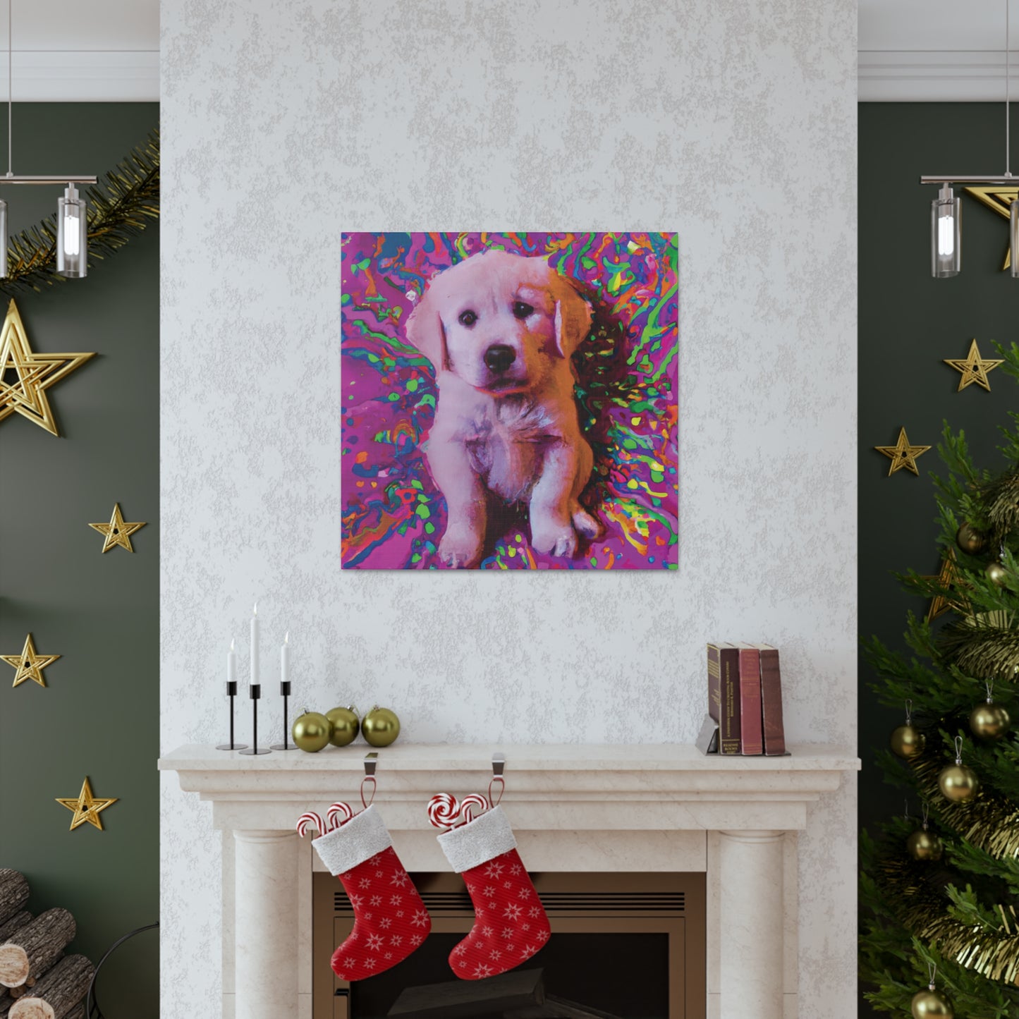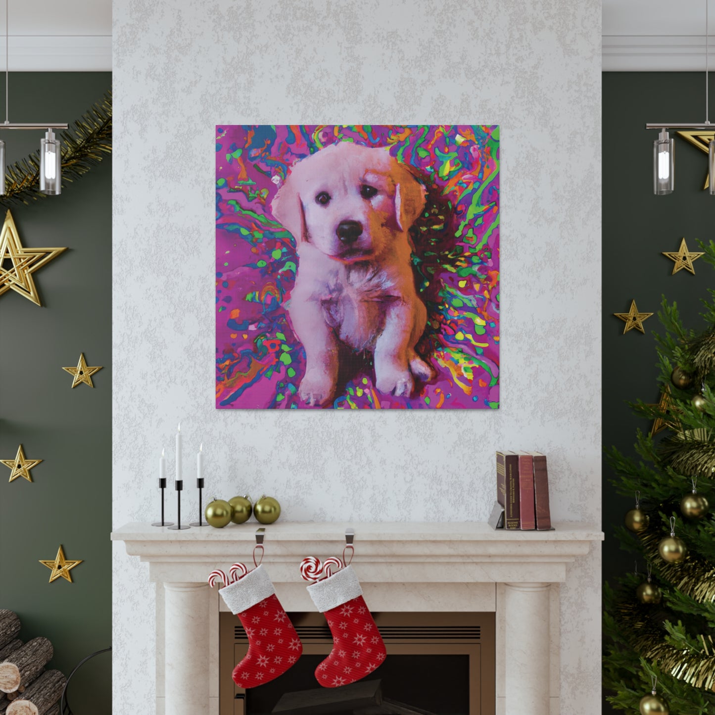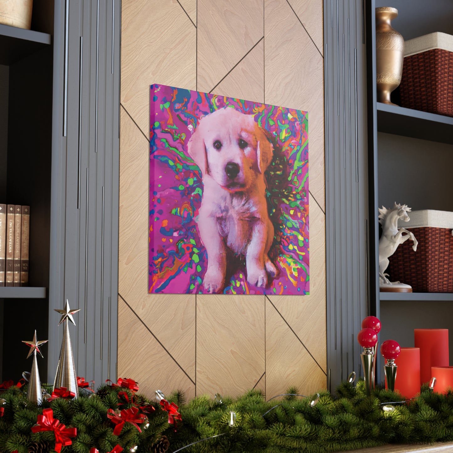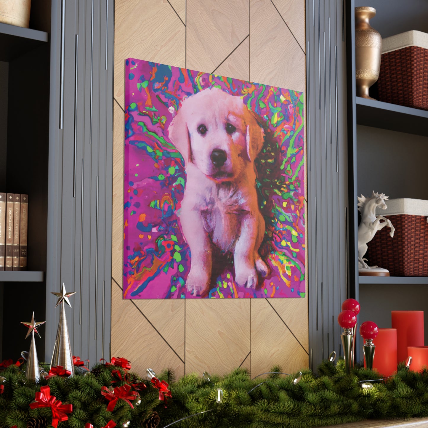 This vibrant canvas will liven up any space with the incredibly whimsical and colorful portrait of a golden retriever puppy. From their soulful eyes to the unique color palette, this painting will bring a dreamy look to your wall and transport you to another realm. Our playful pup will remind you to find joy and live out of the box of everyday obligations. Get ready to make a statement in your space with this mystical and transcendent painting!⭐️ 😊 Plus, you never have to worry about it barking at the UPS truck! #goldenretriever #retrieverpuppy #puppy #dogsofinstagram #artlovers #artforsale #homedecor #canvasart #puppyart #dogart #shopsmall #dogpaintings #wonderfulwalls #creativepainting